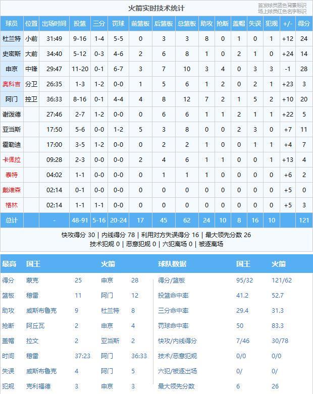 雷诺25分6板3助、蒙克25分3板5助2断、威斯布鲁克12分4板9助、德罗赞12分2板、阿丘瓦10分4板2断、穆雷5分11板1助2帽、拉文2分1板1助2帽、尤班克斯2分1板、克利福德2分2助