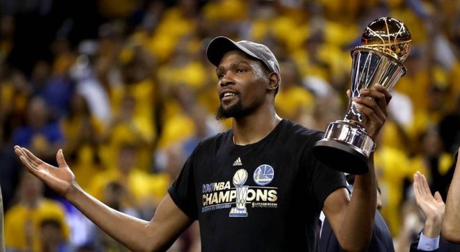 来到勇士之后,杜兰特三度闯入决赛,并拿到两个冠军和两个FMVP。