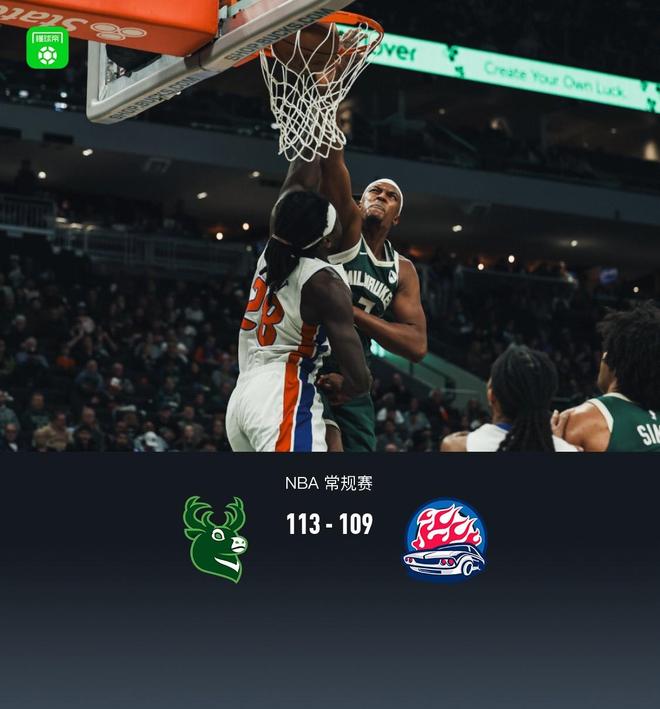 第四节雄鹿AJ-格林拿下11分,活塞保罗-里德拿下7分,最终雄鹿113-109战胜活塞