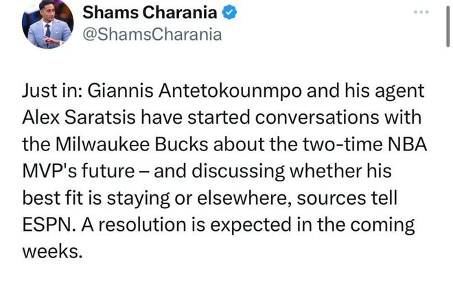 同样来自爆料王Shams的消息源,倘若字母哥申请交易,涉及的球队将远不止纽约尼克斯。薪资专家Marks对此表示,其余29支球队都会跟雄鹿打电话询价字母哥。