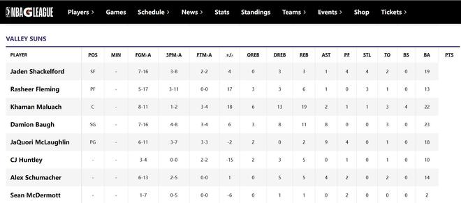 本场比赛,被菲尼克斯太阳队下放到发展联盟练级的今年10号秀马鲁阿奇首发出战,全场比赛马鲁阿奇11投8中高效得到22分19篮板2助攻1抢断4盖帽,展现了自己的能力。